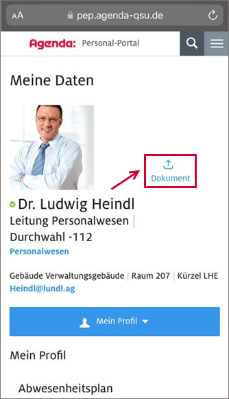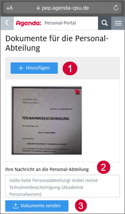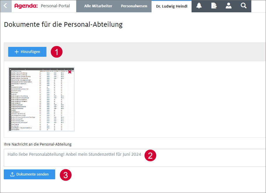 2. Wählen Sie in der Menüleiste das Symbol für <Dokument an die Personalabteilung senden> aus, um zur Upload-Seite zu gelangen.