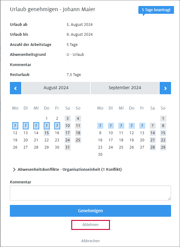 4. Wählen Sie den Antrag aus und klicken auf <Ablehnen>.